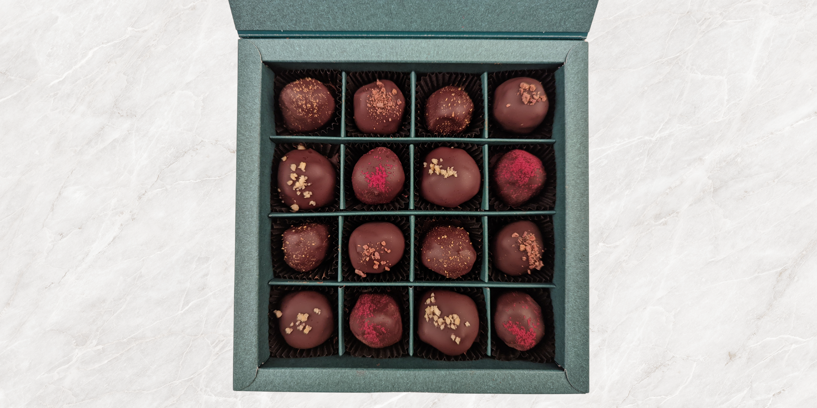 Unsere großes, gemischtes Mixpack ist der Bestseller mit 16 Dattelpralinen. Hier ist für jeden was dabei und genug zum Teilen. Als günstigere Variante eignet sich die kleine Packung mit 9 Dattelpralinen perfekt.