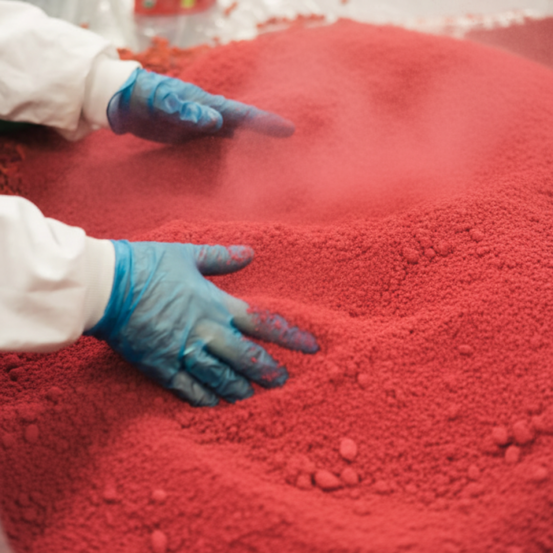 Für 1 kg Himbeerpulver benötigen wir 10kg Himbeeren. Dann kommen noch Himbeerstückchen dazu. Nur so schmeckt es reif, fruchtig und echt. 1123% Himbeere.