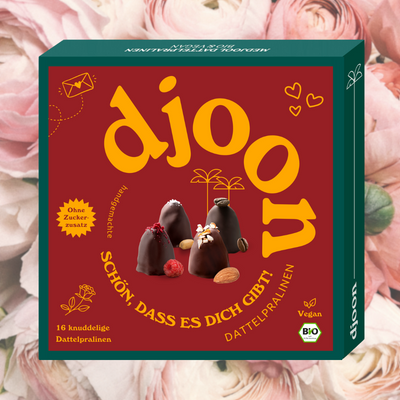 Das beste Geschenk für dich und deine Liebsten: Halbierte cremig-karamellige Medjool Datteln gefüllt mit himmlischen Cremes aus leicht gesalzenen und gerösteten Erdnüssen, Mandeln, fruchtigen Himbeeren und intensiven Espressobohnen, umhüllt mit knackiger Schokolade aus 100% Kakao. Du brauchst keinen Grund, aber wenn du einen hast, haben wir das richtige Geschenk für dich! 16 Pralinen, 180g.